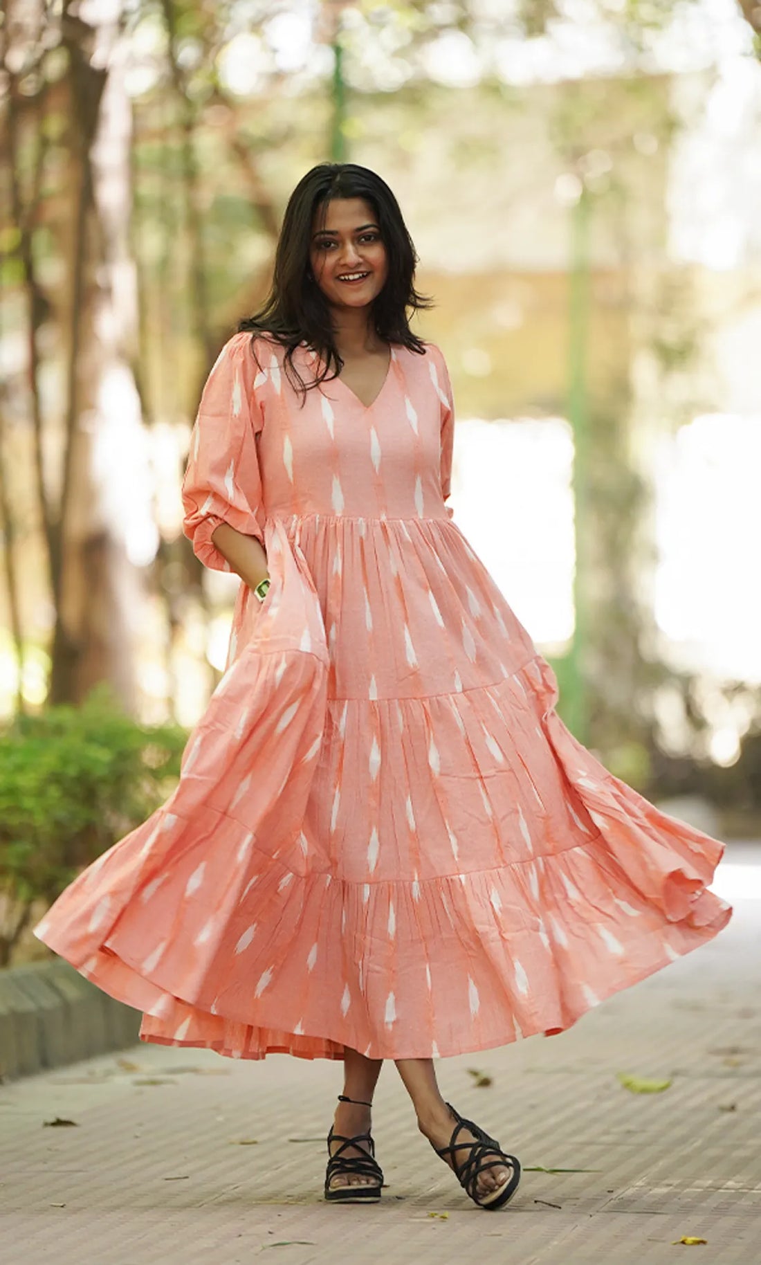 Step into timeless, effortless style with this Green Ikat Printed Pure Cotton A-Line Midi...