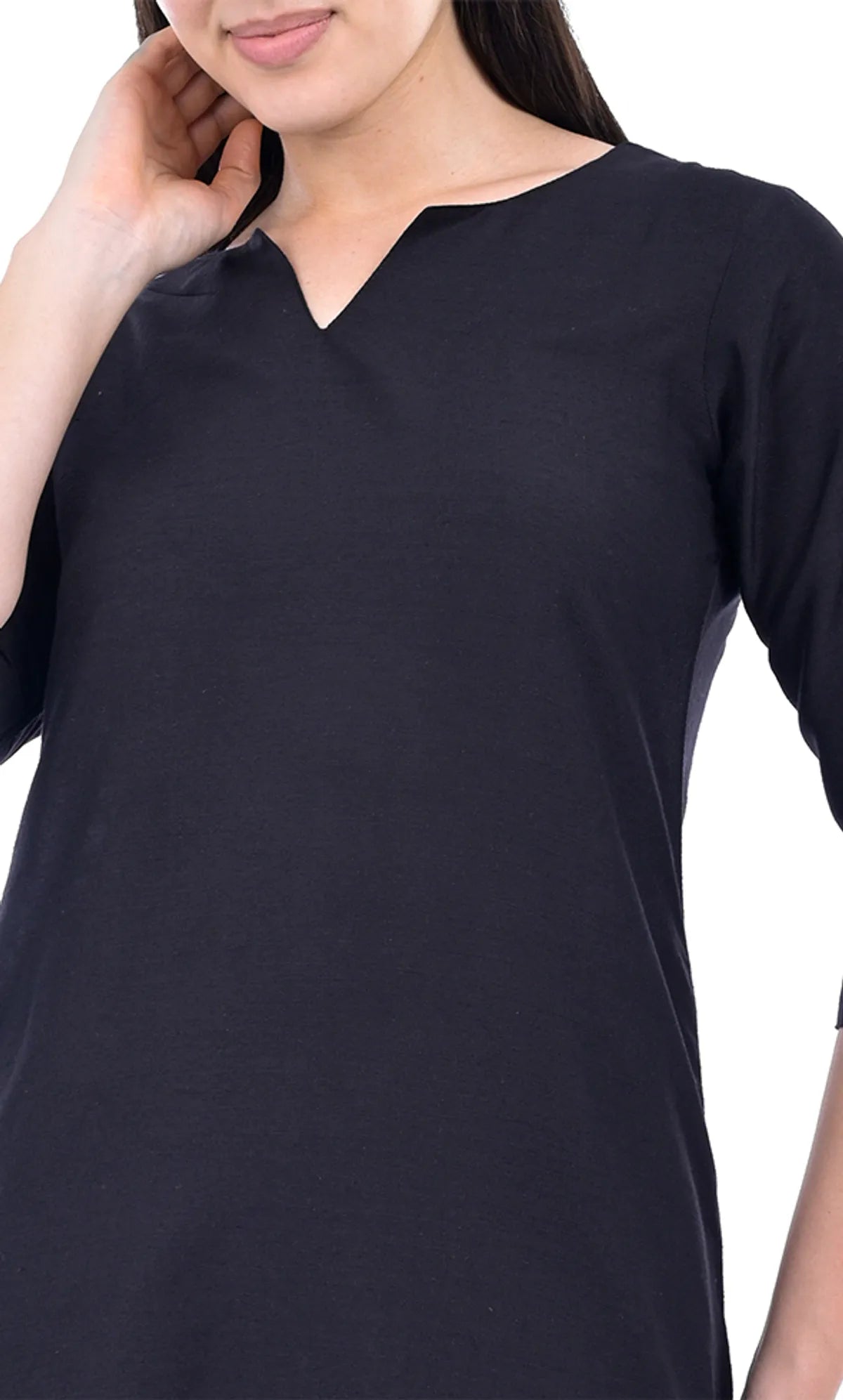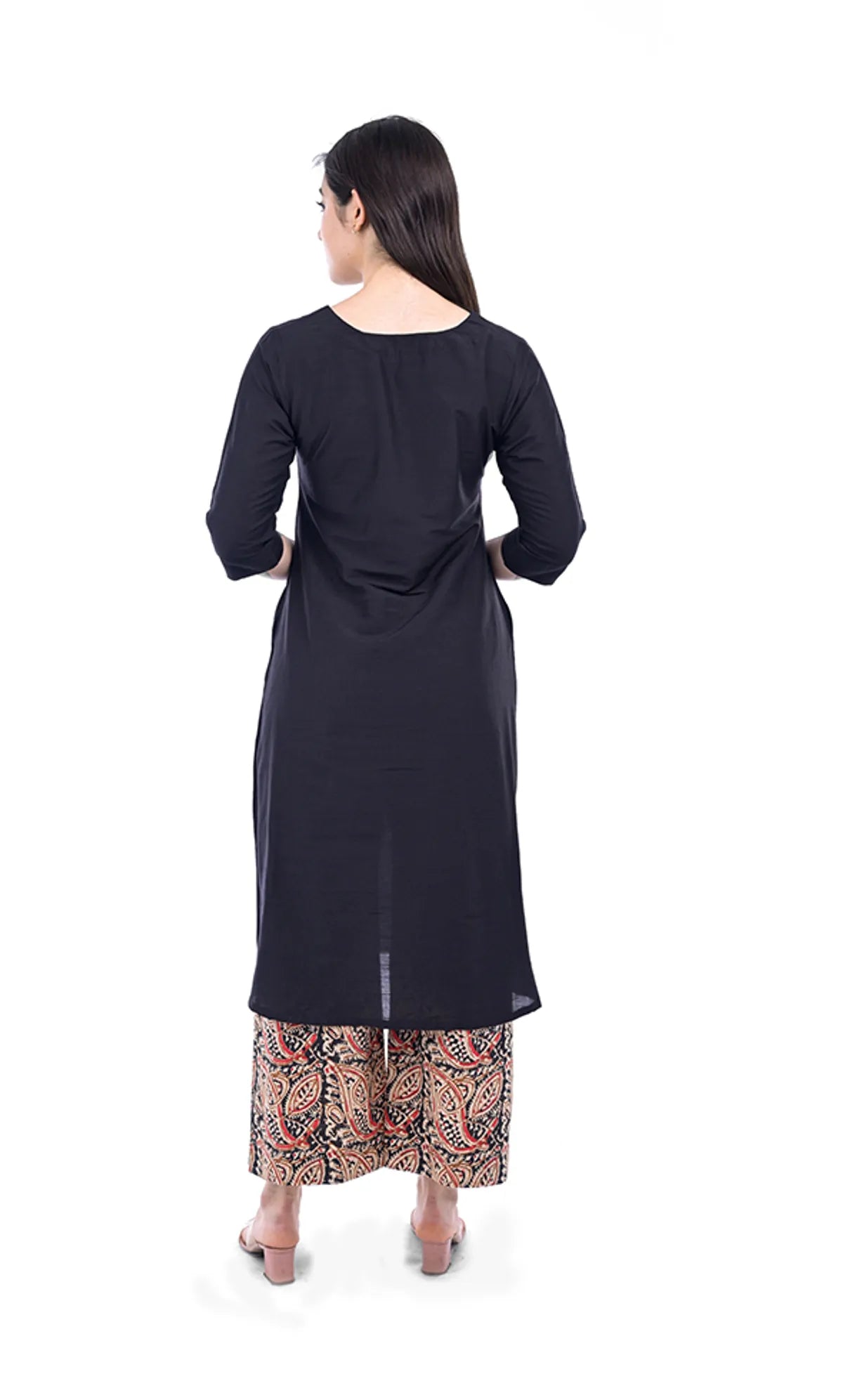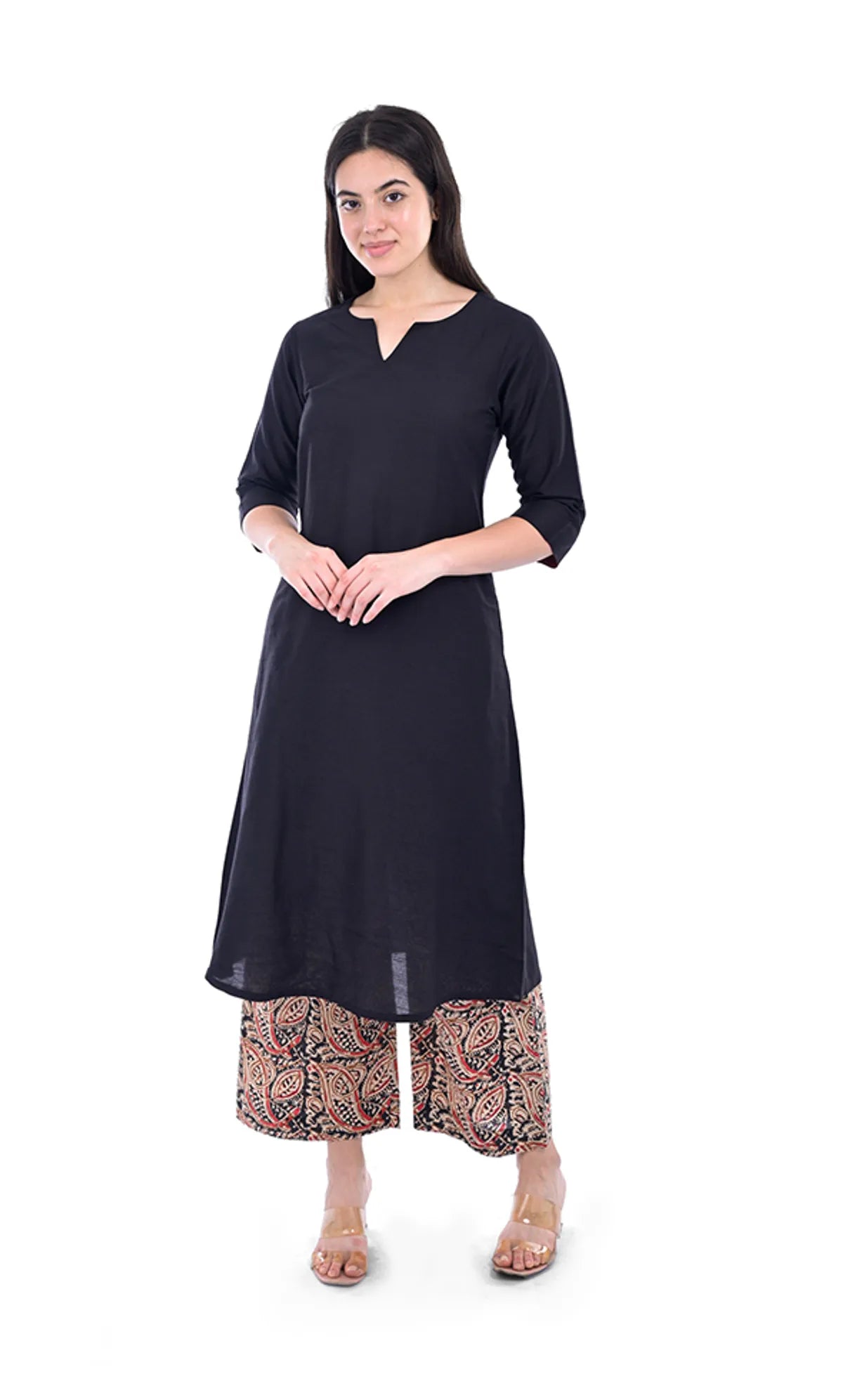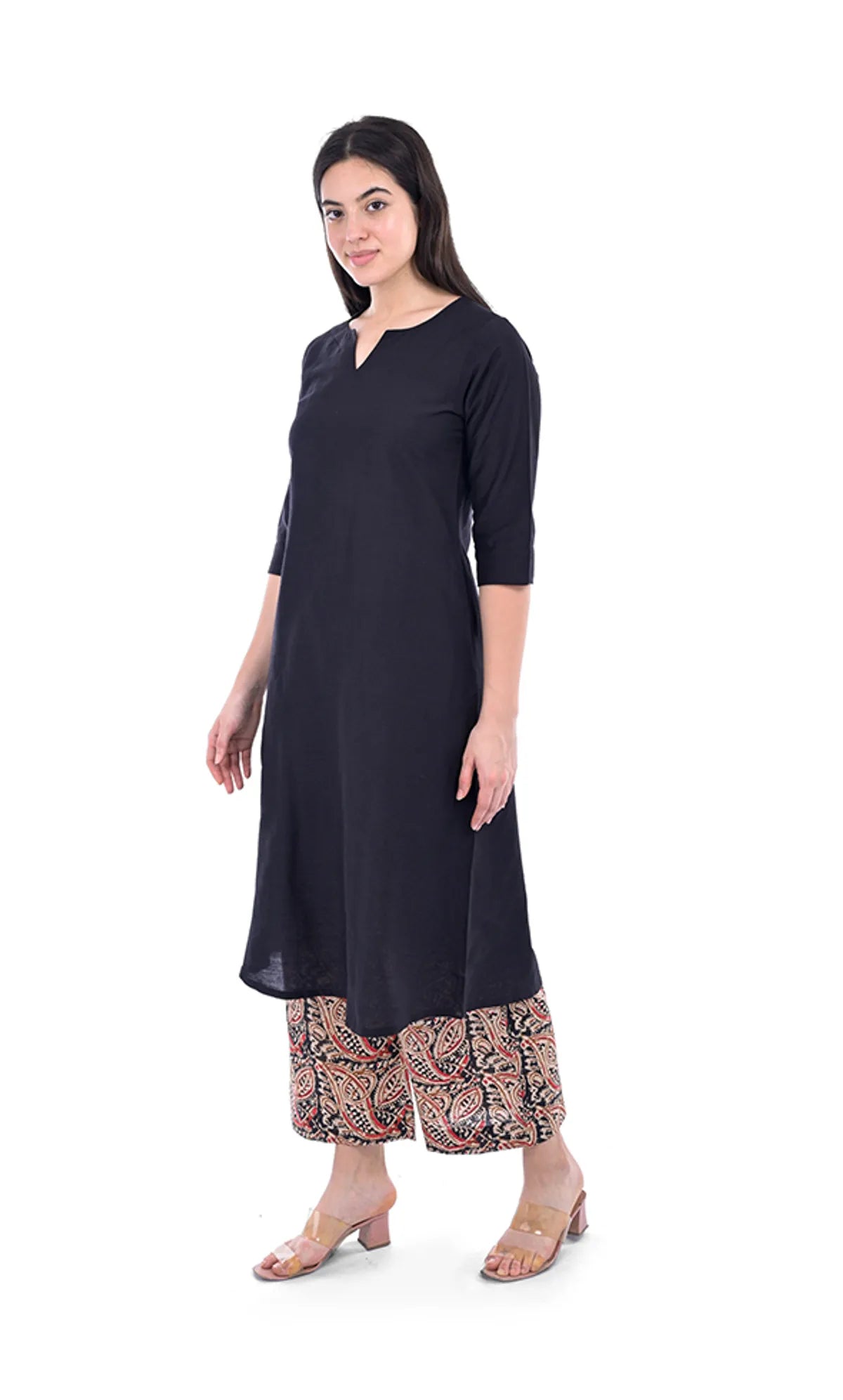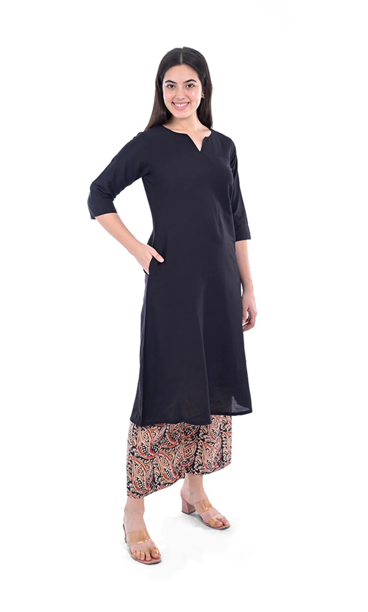 Elevate your ethnic wardrobe with this Black Solid A-Line Kurta Pant Set by CODE ROSE. This classic two-piece ensemble combines a solid black A-line kurta with coordinated pants, crafted from high-quality natural cotton for breathable comfort and everyday ease. The timeless black silhouette offers versatile styling for casual outings, daytime events, office wear, and festive or family occasions. The breathable fabric ensures comfort throughout the day, and the flattering A-line design creates a graceful silhouette for women of all shapes and sizes.