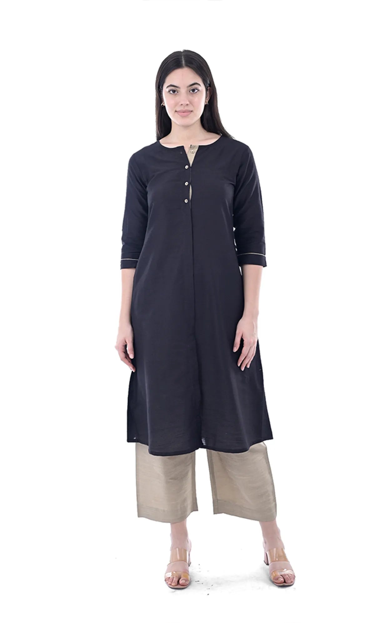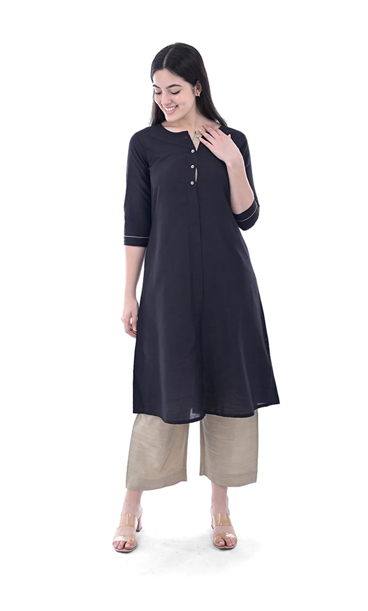 Elevate your ethnic and casual wardrobe with this Black Solid Kurta For Women & Girls by CODE ROSE. Made from high-quality natural cotton, this solid black kurta offers breathable comfort and effortless style. Its minimalist design makes it an ideal versatile piece for daily wear, casual outings, work, family gatherings, and festive occasions. The timeless solid colour pairs perfectly with a range of bottoms including leggings, palazzos, and jeans, giving you ease in styling from day to night. The soft cotton ensures comfort throughout the day while the classic silhouette flatters a range of body types. (turn1view0)