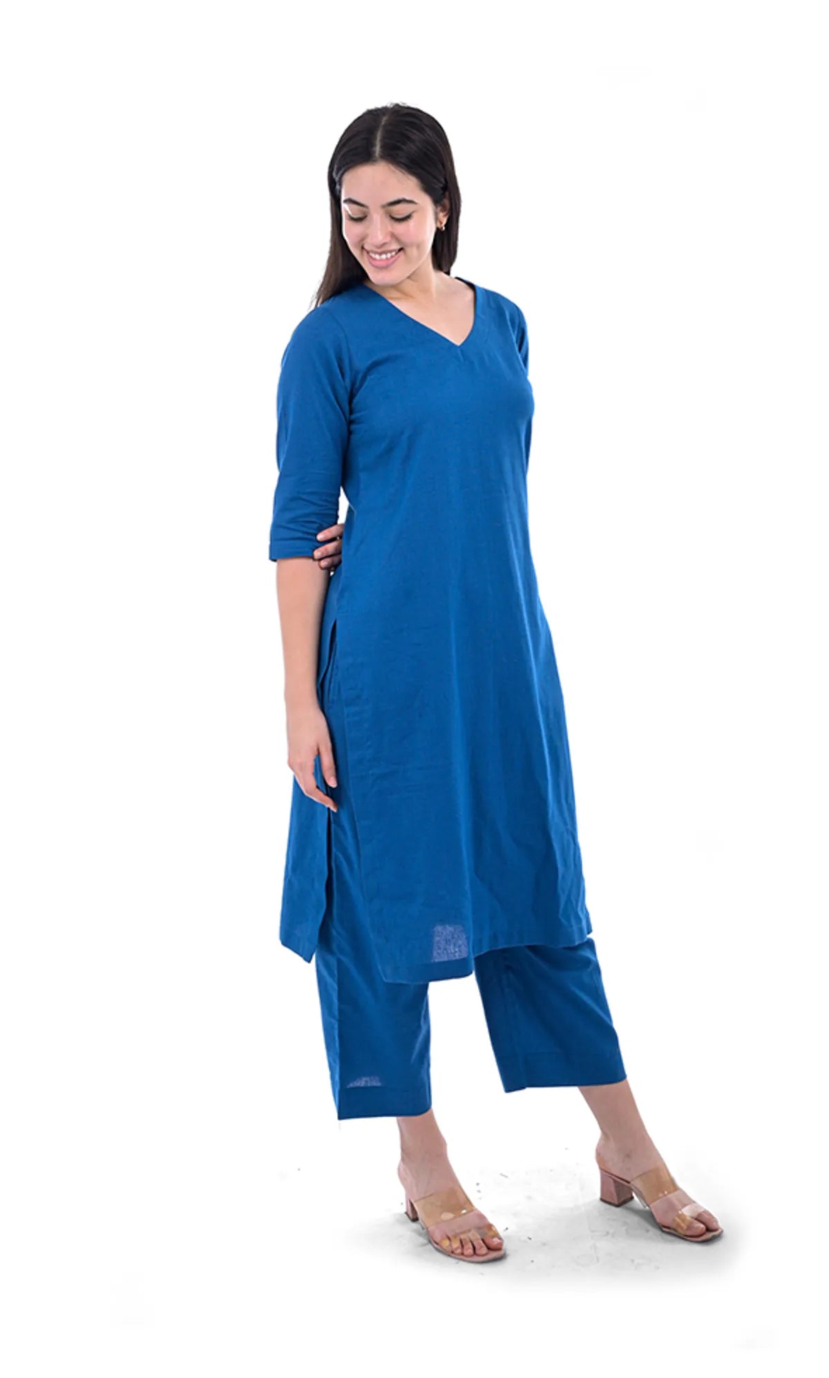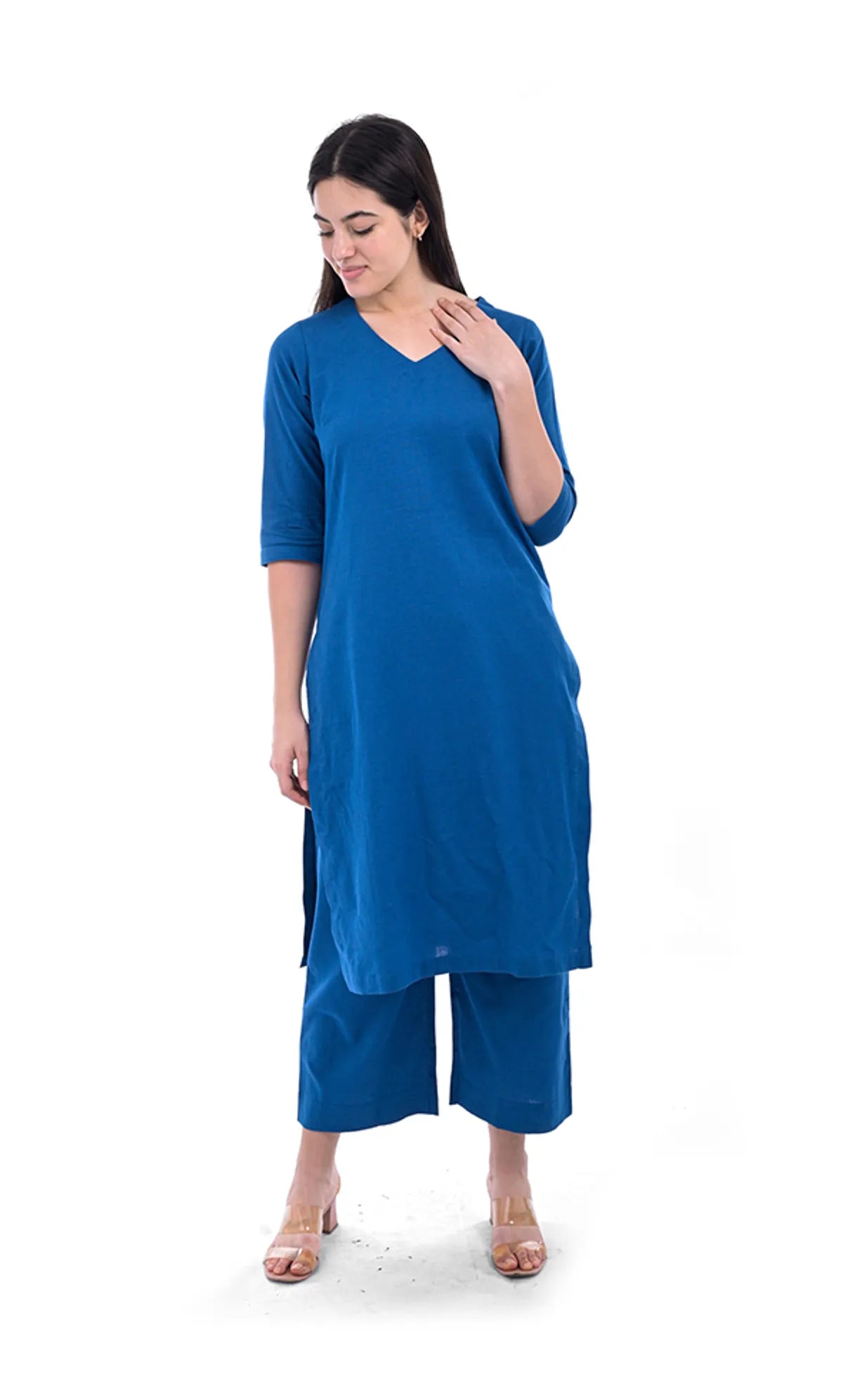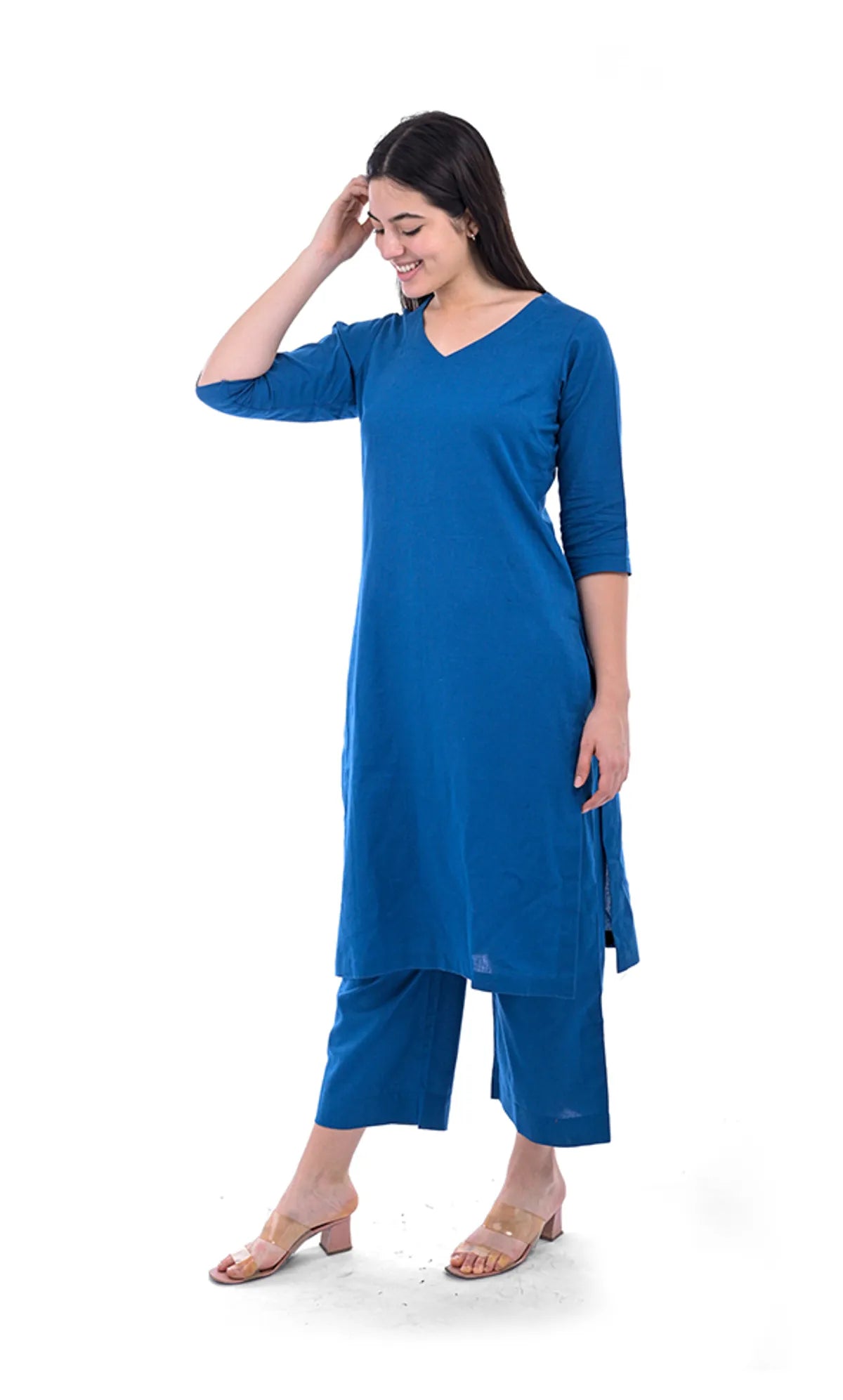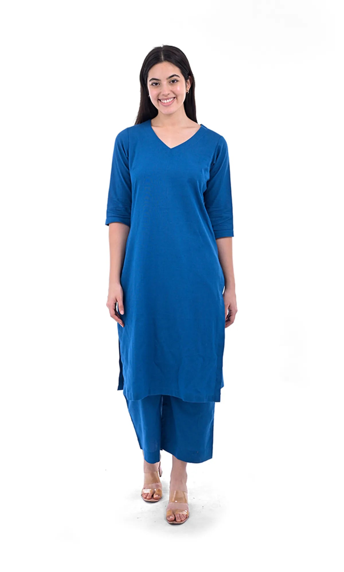 Refresh your ethnic wardrobe with this Blue Solid Khadi Cotton A-Line Kurta and Pant Set by CODE ROSE. This stylish two-piece ethnic ensemble includes a solid blue A-line kurta paired with coordinating pants, crafted from high-quality natural cotton for breathable comfort and everyday wearability. The classic blue hue and flattering A-line silhouette make this set versatile enough for casual outings, everyday wear, office, family gatherings, and semi-festive occasions. Its soft, premium fabric ensures comfort throughout the day while providing a timeless look that pairs beautifully with minimal jewelry and sandals.