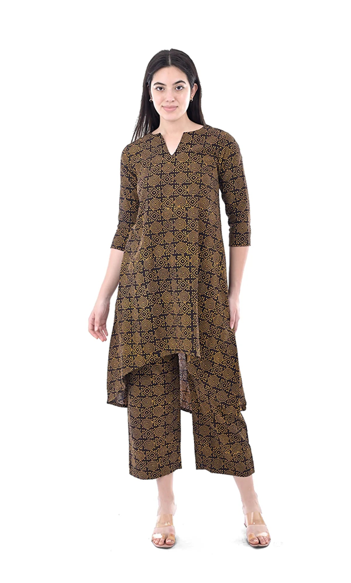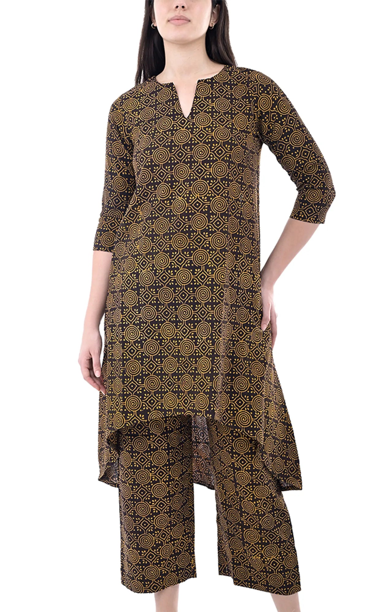 Print/Pattern: Abstract hand block print in brown tones — traditional and artisanal appeal.