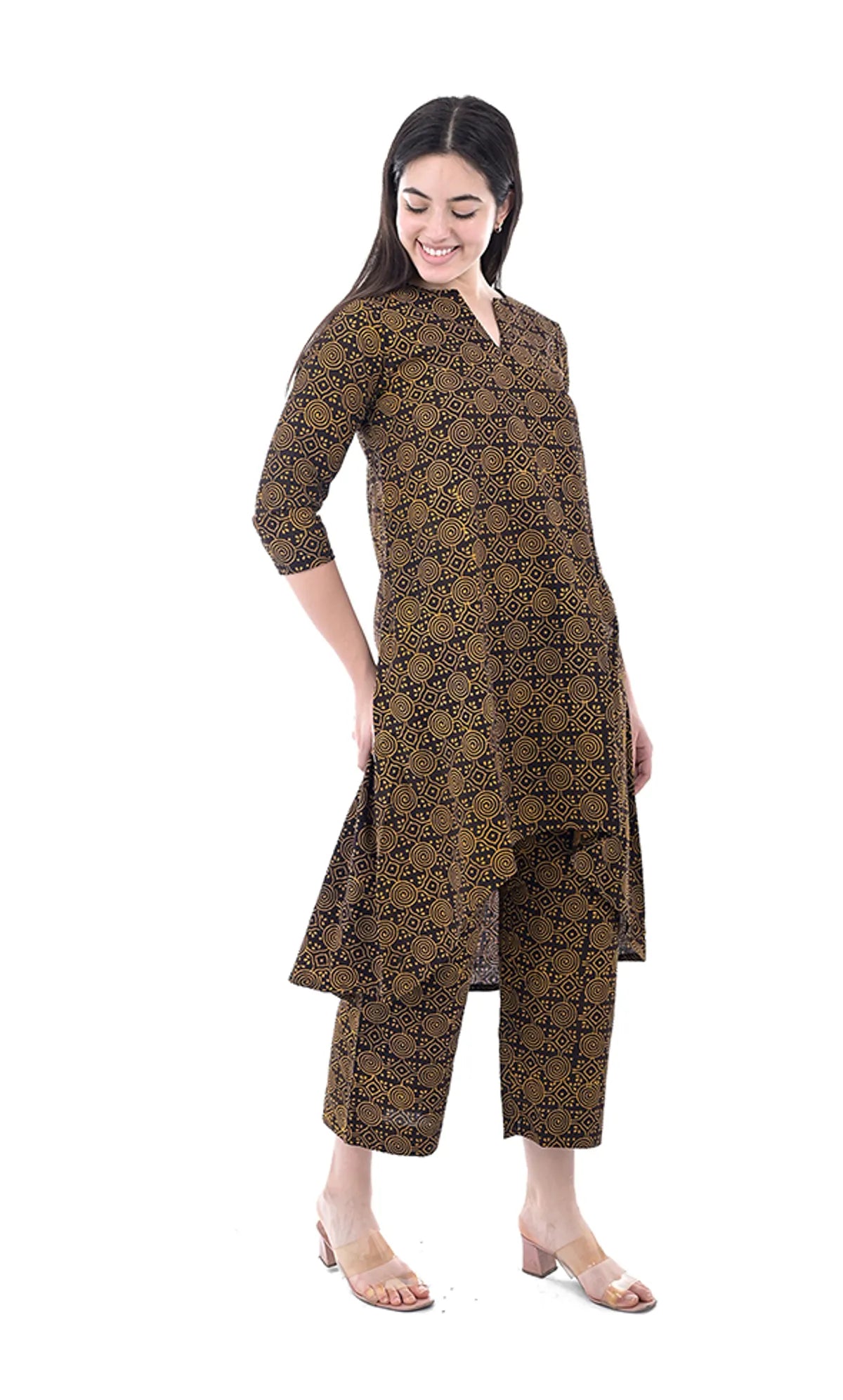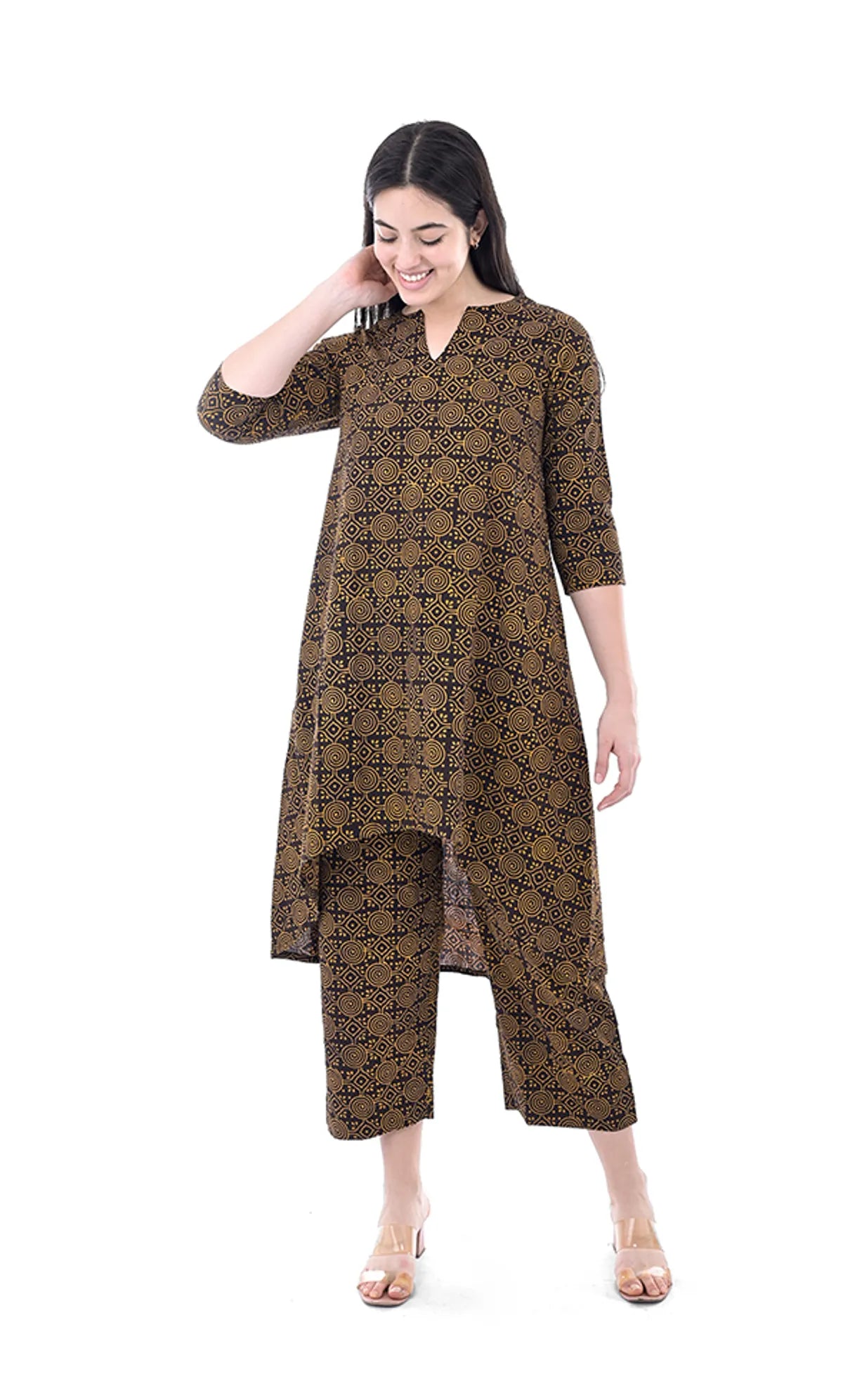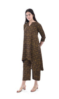 Refresh your ethnic wardrobe with this Brown Abstract Print Pure Hand Block Cotton A-Line Kurta Pant Set by CODE ROSE. This charming two-piece set includes a beautifully hand-block printed A-line kurta paired with matching pants, crafted from high-quality natural cotton for breathable comfort and effortless style. The abstract brown print adds a unique artisanal flair, making this set ideal for casual outings, daytime events, festive gatherings, and everyday wear. Its relaxed silhouette ensures comfort throughout the day while the traditional hand block print gives it a timeless look.