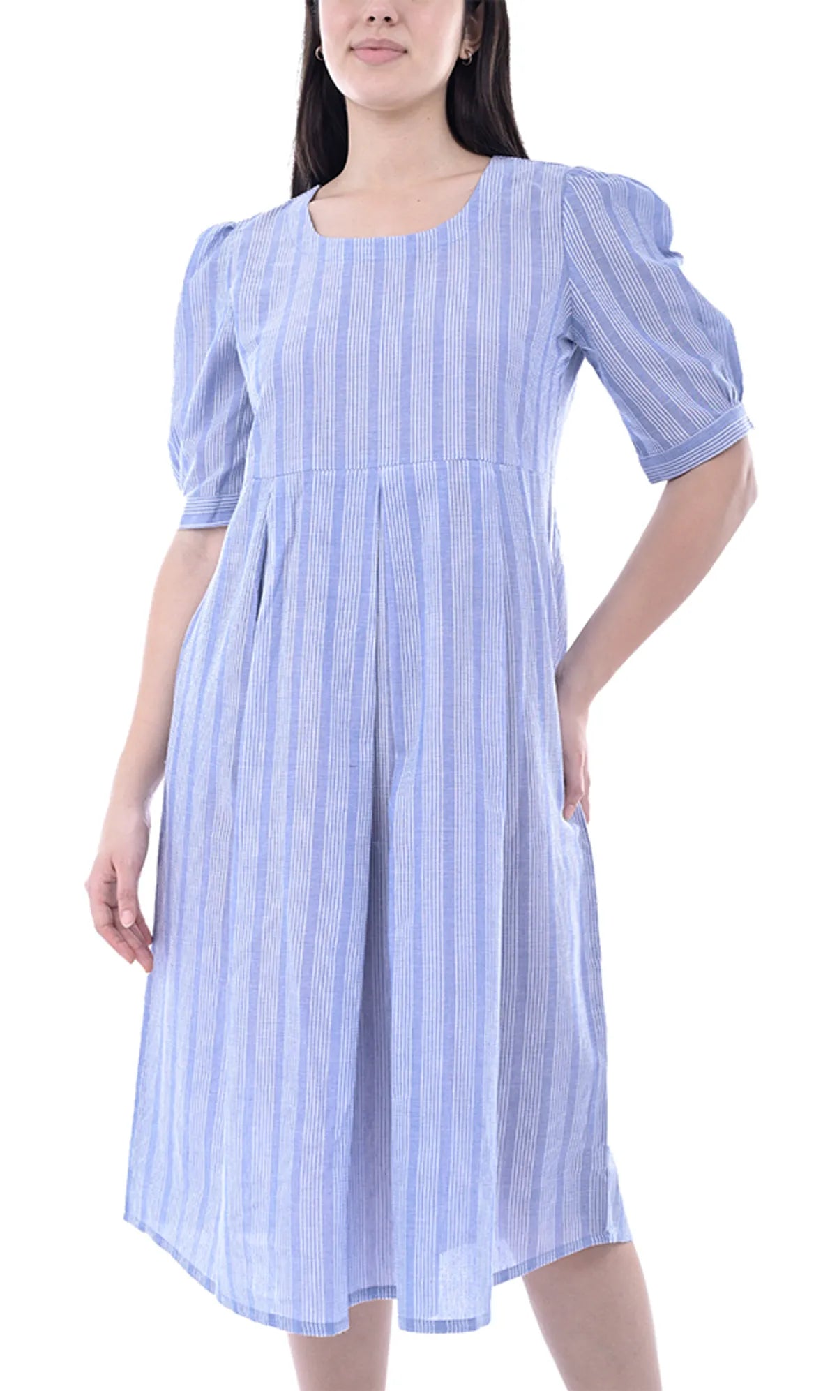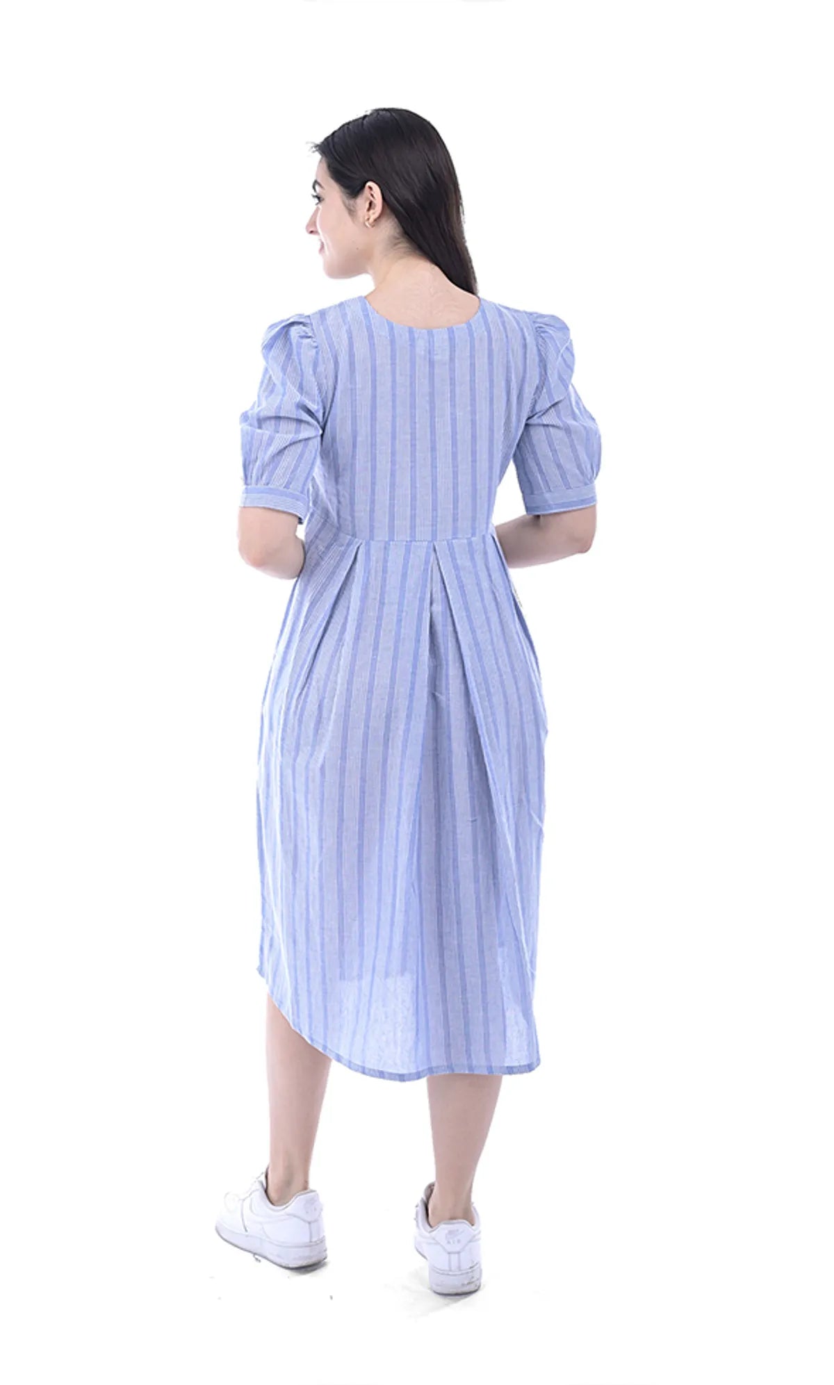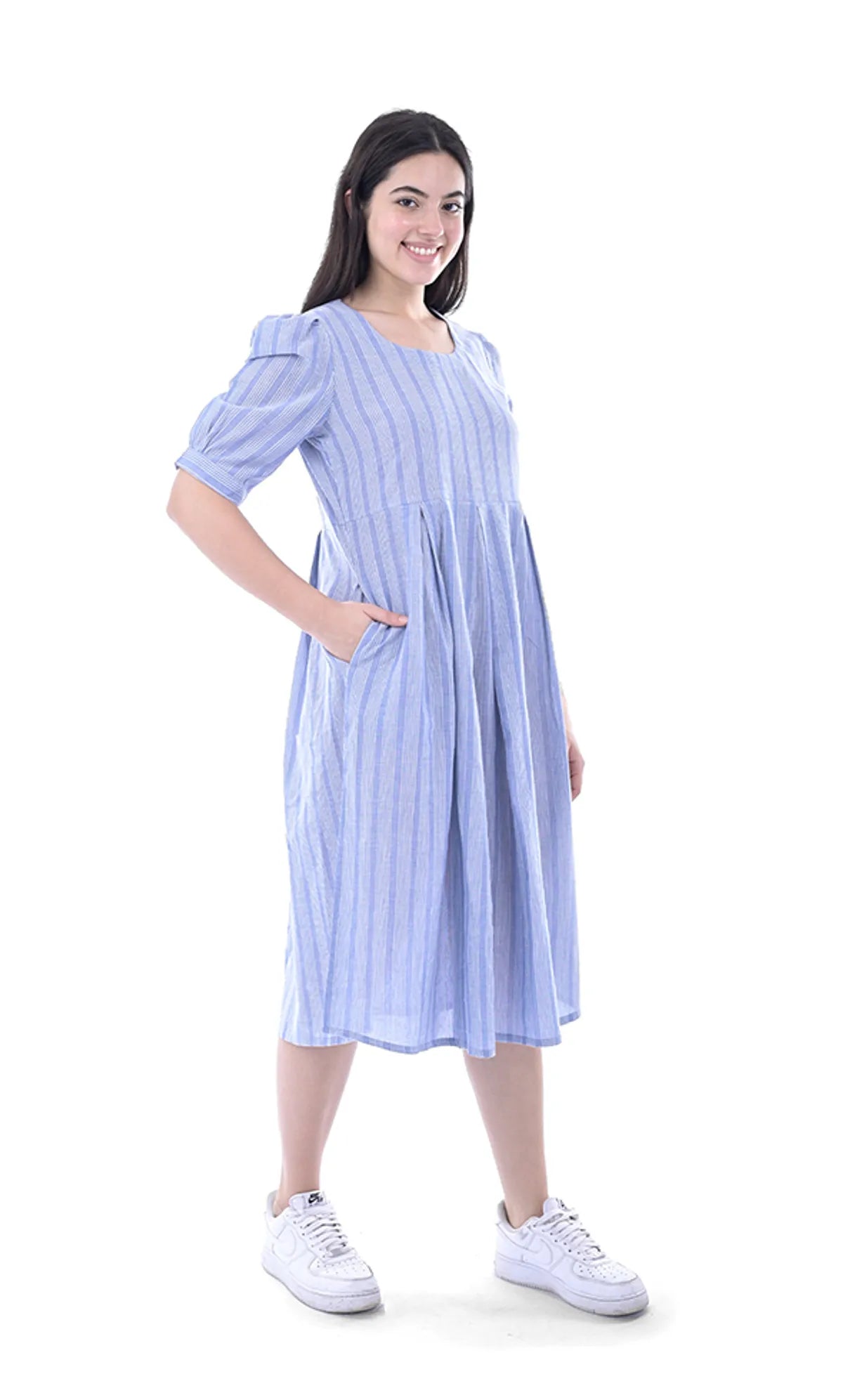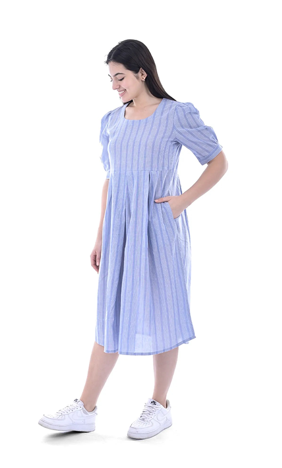 Chrambray Light Blue Stripes Handloom Cotton Fit & Flare Dress For Women & Girls