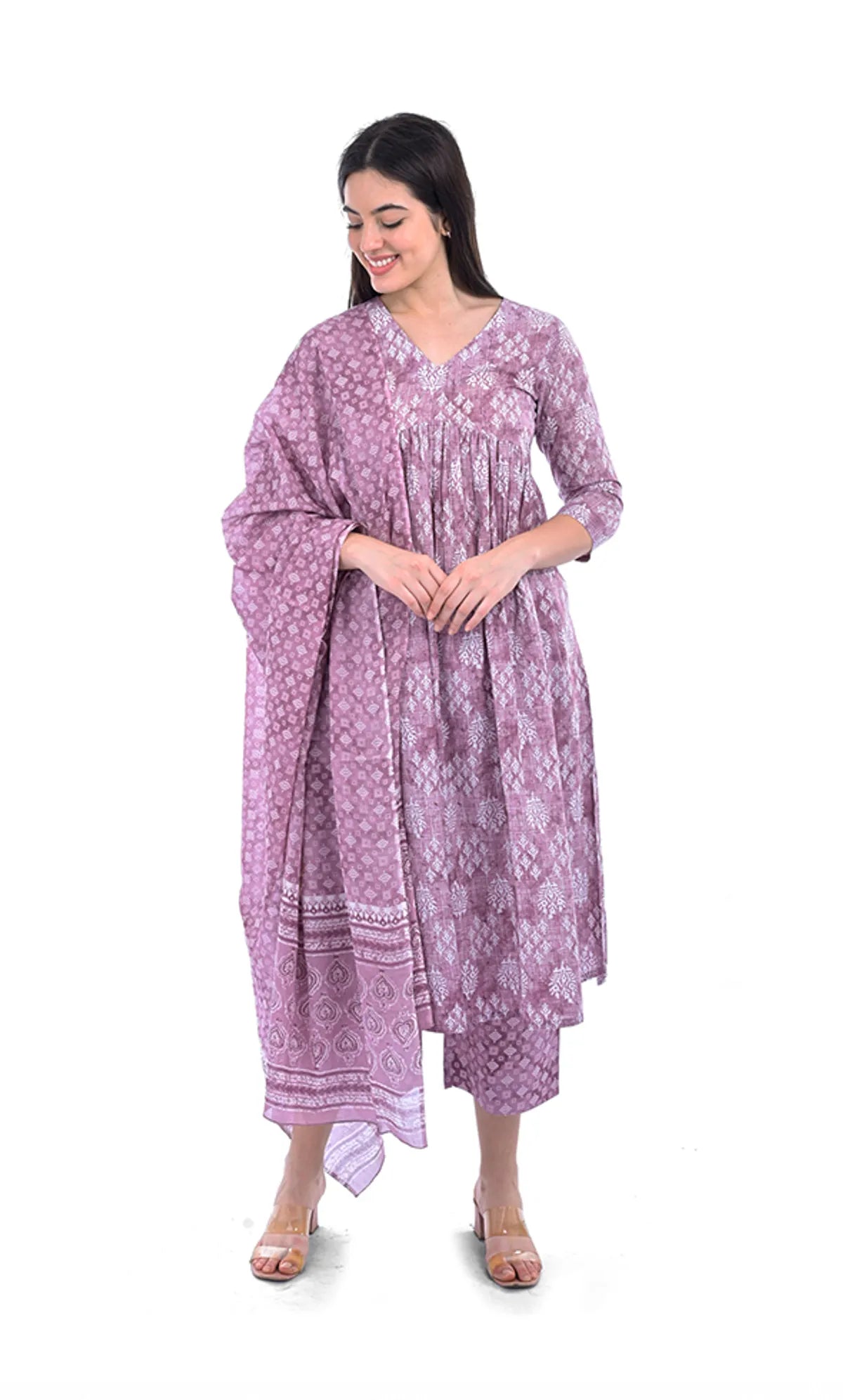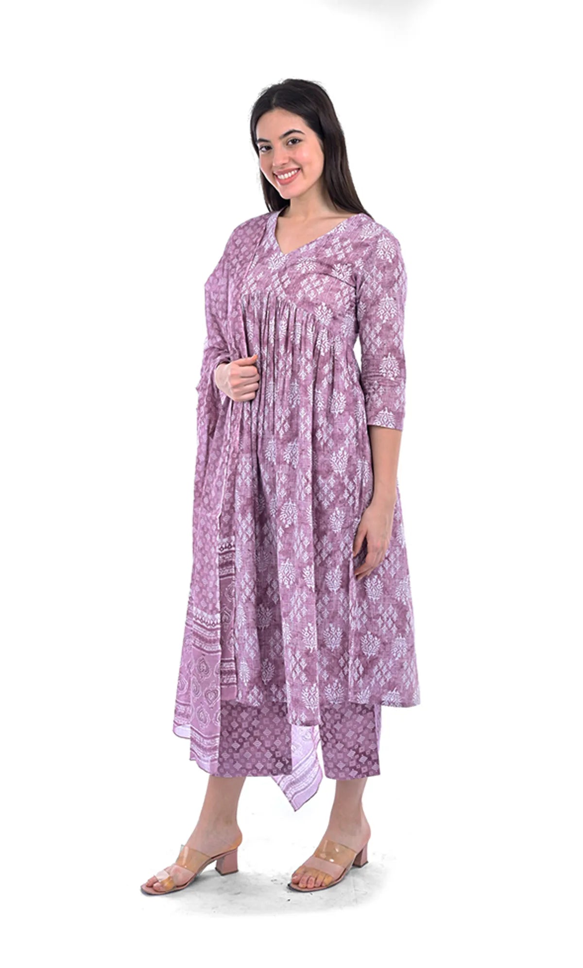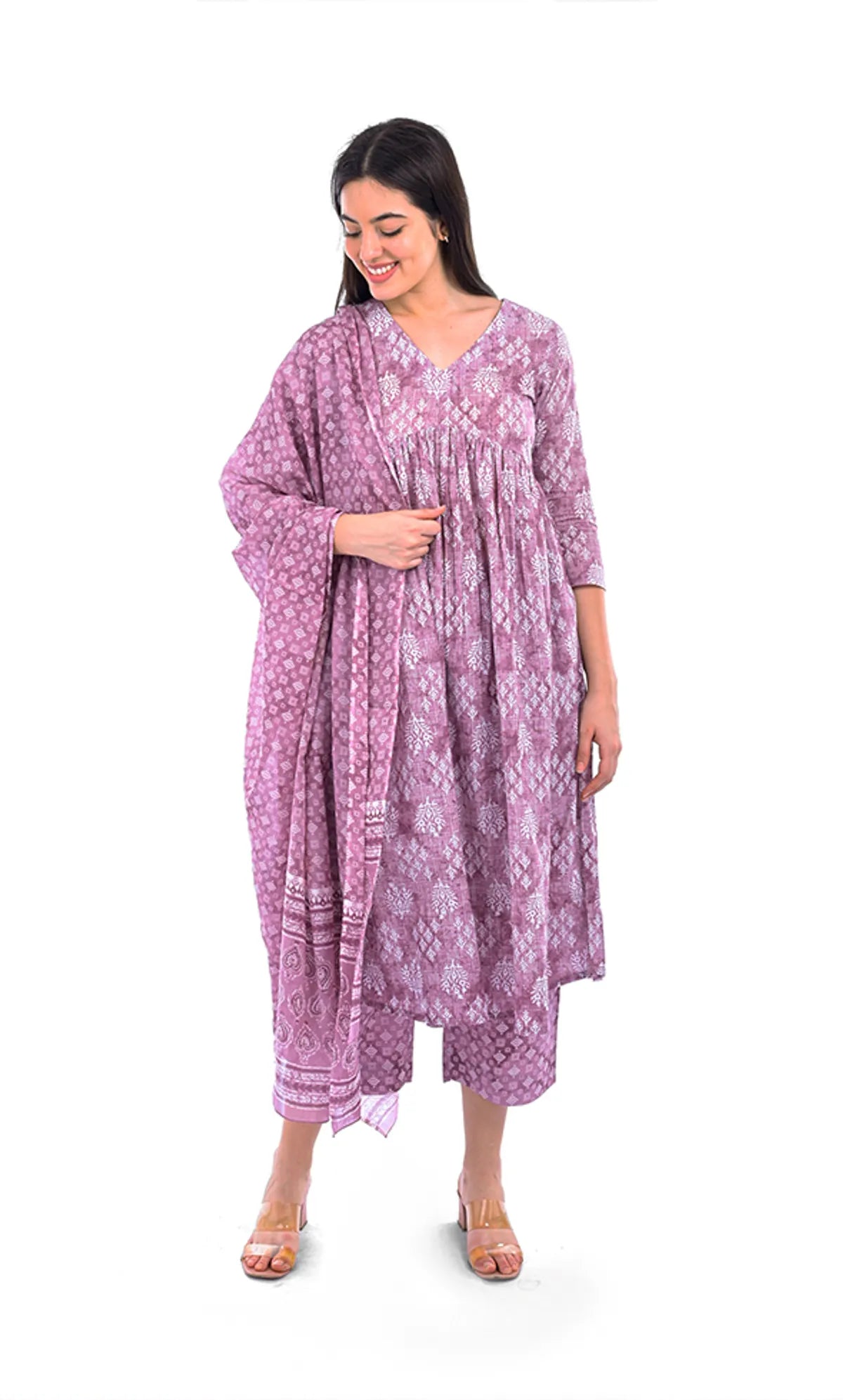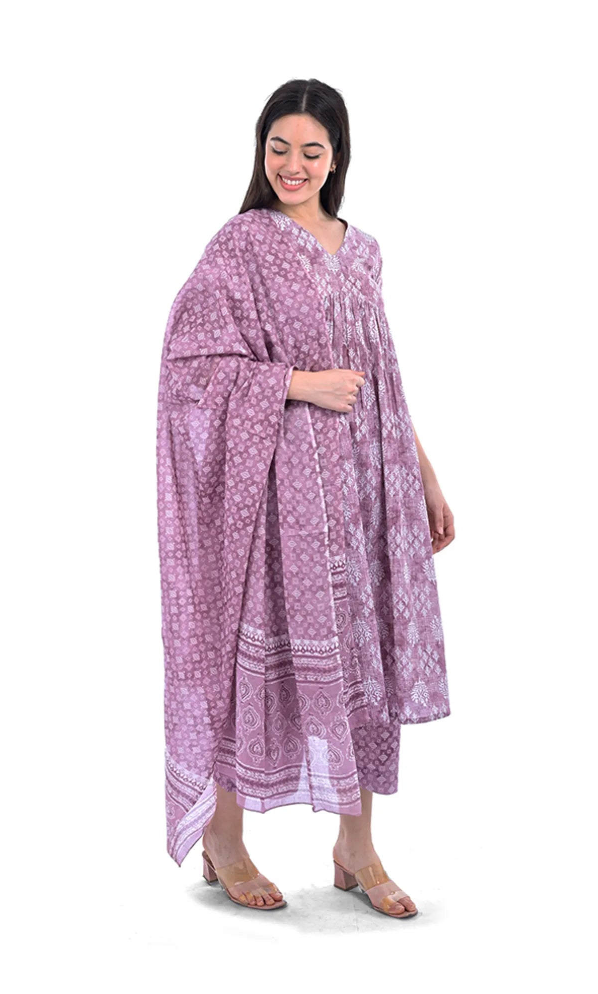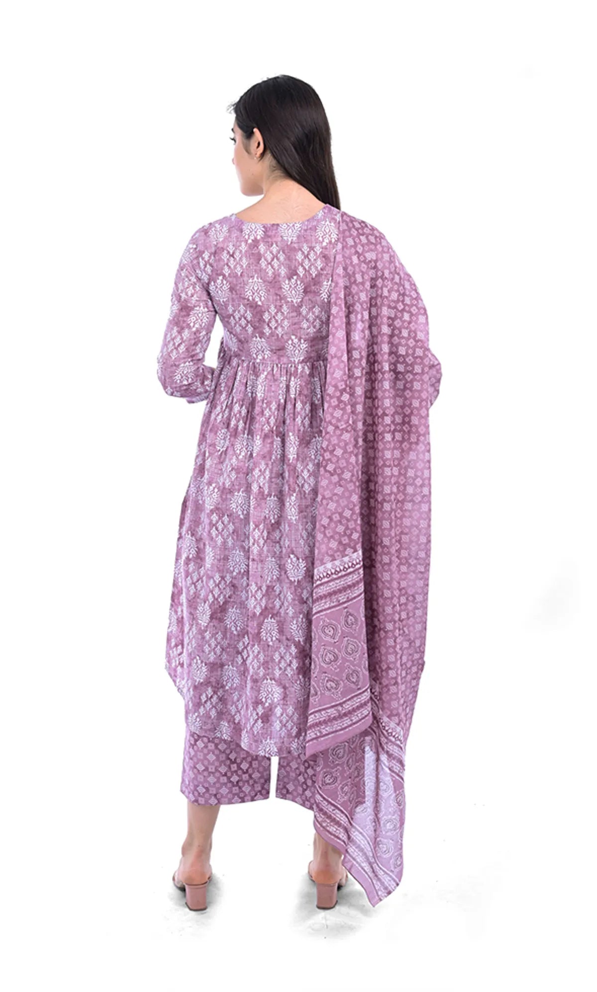 Mauve Straight Kurta Pant & Dupatta Set For Women — Floral Printed Pure Cotton Three-Piece Ethnic Set